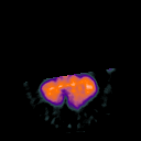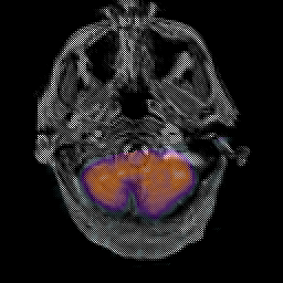 Click on sagittal image to select slice. Click on thin tickmark to change timepoint, or thick tickmark for overlay.