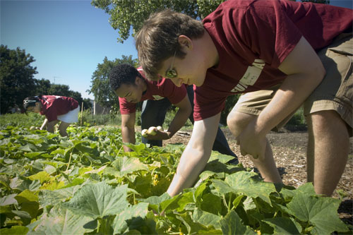 The week before, 42 first-years participated in the First-year Urban Neighborhood Campaign (FUNC), a pre-orientation, week-long volunteer program led by second-year students. FUNC students participated in several service projects linking food and nutrition with environmental sustainability, including working with the Food Project, which grows fruits and vegetables for the surrounding communities using sustainable farming techniques. The first-years harvested vegetables later sold at the Dudley Town Common farmer’s market and also weeded and assisted with other tasks at two of the Food Project’s lots in Dorchester. Other students visited Hennigan Elementary School in Jamaica Plain for Science Savvy, a week-long science camp for kids organized by Prevention NOW!, a youth center that provides after-school and summer programs for minority and urban children. HMS students led the children in a variety of activities, helping them make ice cream, silly putty, and model rockets, and they also took the kids for a visit to the medical simulator in the Tosteson Medical Education Center. Above, Greg Cvetanovich (right) and Julian Johnson experienced a little bit of country in the city at one of the Food Project sites.