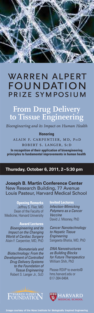 Langer, senior lecturer on surgery at HMS and the David H. Koch Institute Professor at the Massachusetts Institute of Technology, is known widely for his advancements in both drug delivery and tissue engineering. He has developed polymers to deliver drugs continuously at controlled rates over time and has engineered blood vessels and vascularized skeletal muscle tissue. The world’s most cited engineer, Langer holds more than 800 granted or pending patents and is the youngest person to be elected to all three National Academies. Other recognitions include the National Medal of Science, the Charles Stark Draper Prize and the Albany Medical Center Prize in Medicine and Biomedical Research; he is to receive the American Chemical Society Priestley Medal in 2012.